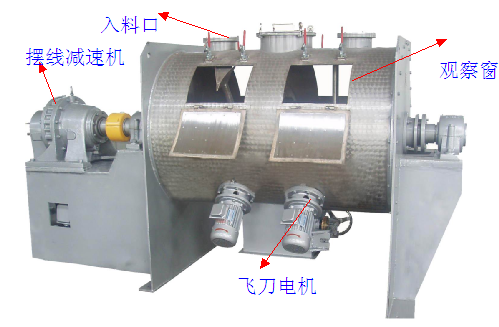 臥式犁刀混合機傳動部分由電機、擺線針輪減速機、聯軸器、犁刀軸等部件組成。